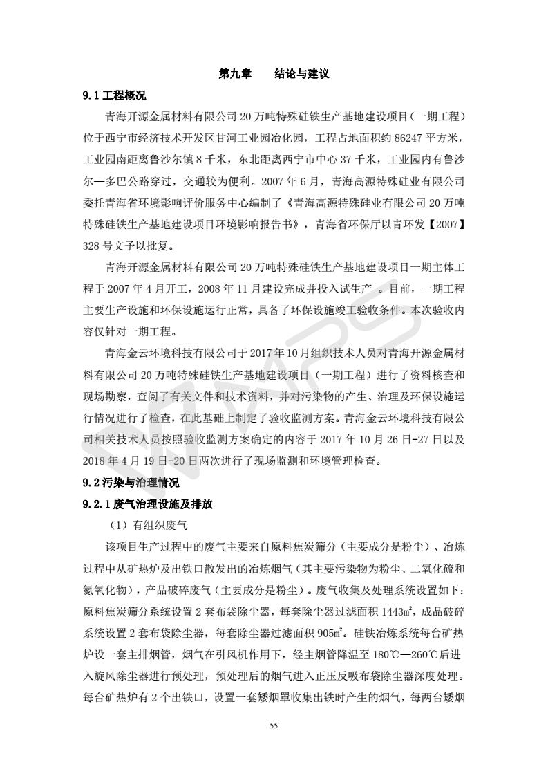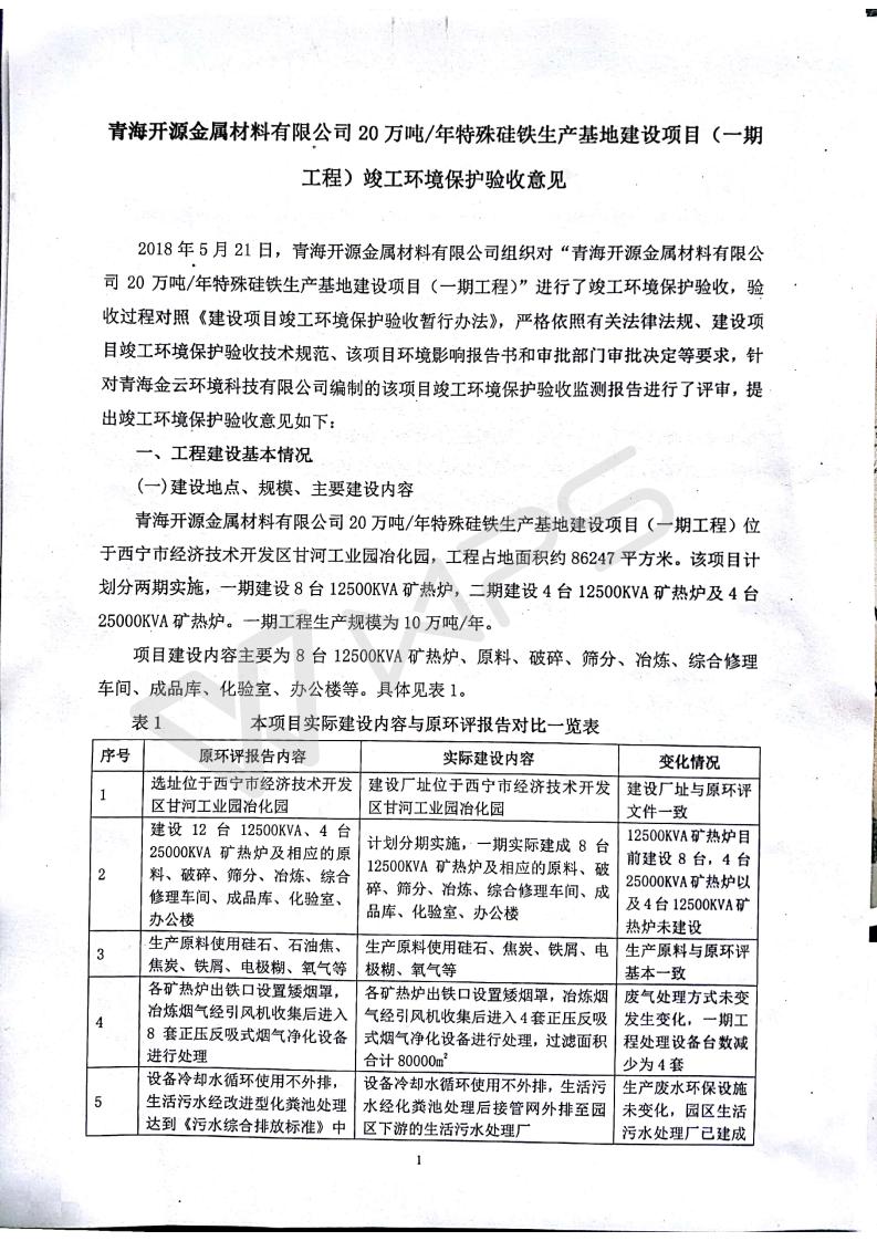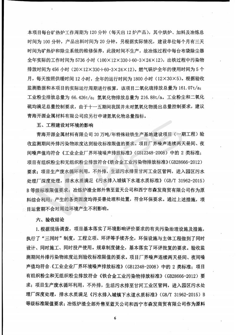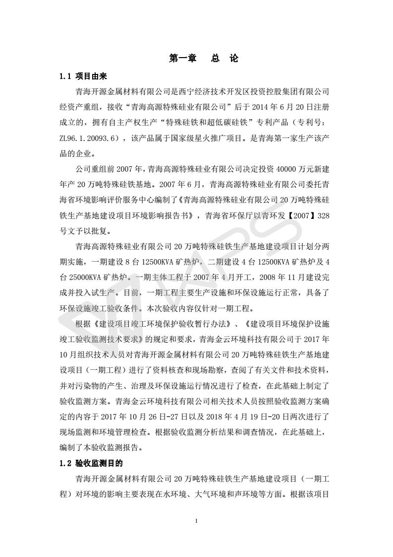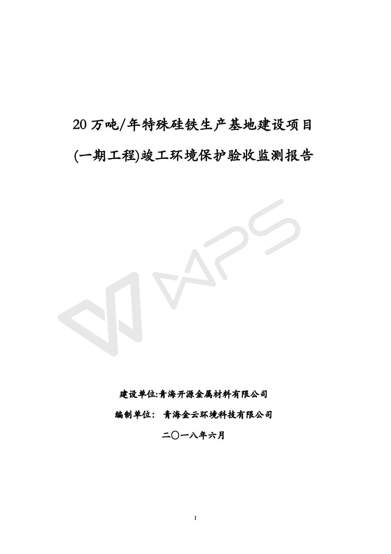 青海開源金屬材料有限公司20萬噸特殊硅鐵生產(chǎn)基地建設(shè)項目(一期工程)竣工環(huán)境保護(hù)驗收報告書會后修改20180521