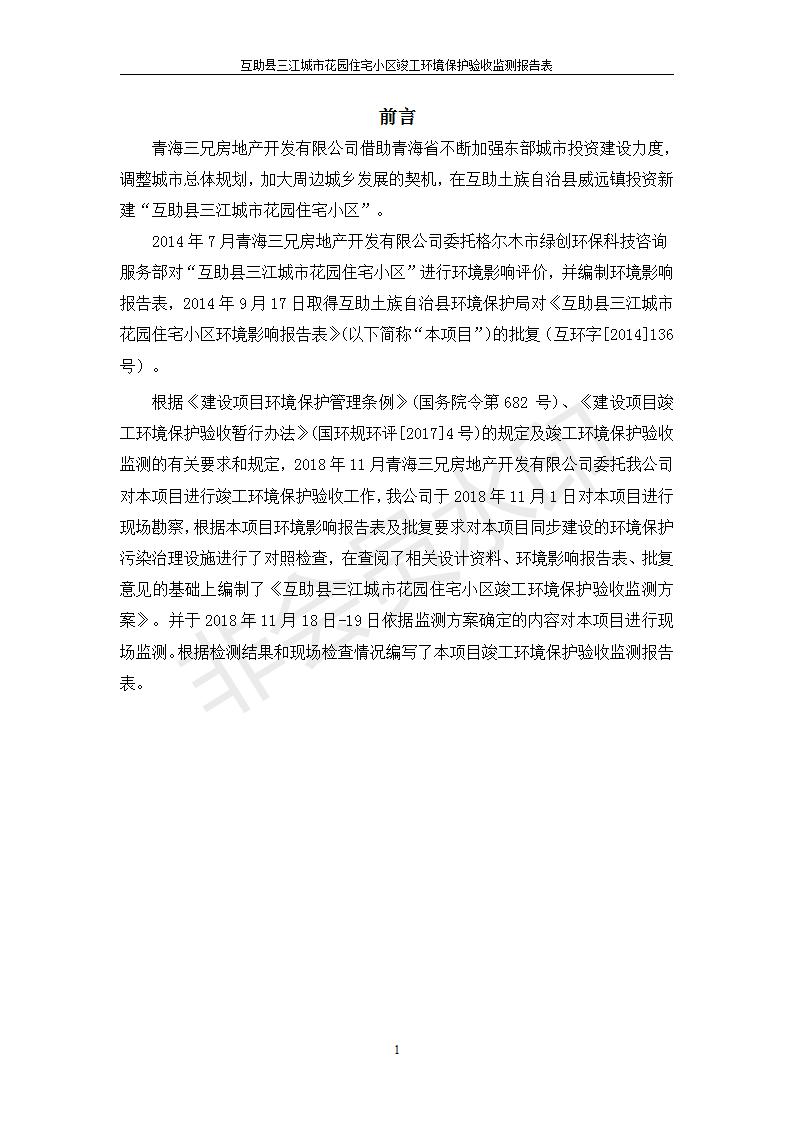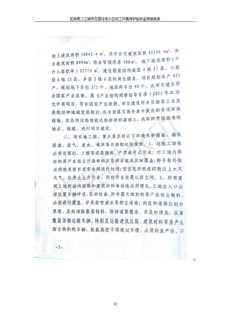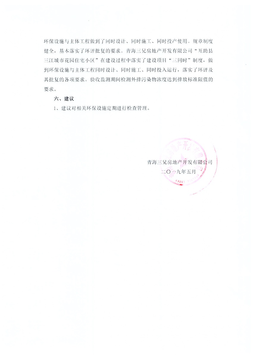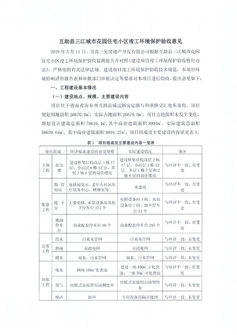 根據(jù)中華人民共和國國務院令第682號《國務院關于修改〈建設項目環(huán)境保護管理條例〉的決定》和《建設項目竣工環(huán)境保護驗收暫行辦法》(國務院令682號),互助縣三江城市花園住宅小區(qū)(包括竣工環(huán)境保護驗收監(jiān)測報告表和驗收意見)公示如下。 一、項目名稱: 互助縣三江城市花園住宅小區(qū)竣工環(huán)境保護驗收監(jiān)測報告表 二、地點:青海省海東市互助土族自治縣威遠鎮(zhèn)安定路與和諧路交匯處東南角 三、建設單位:青海三兄房地產(chǎn)開發(fā)有限公司 四、建設內(nèi)容:項目規(guī)劃用地面積26670.0m2,實際占地面積26670.0m2,項目占地面積未發(fā)生變化,規(guī)劃設計建筑總面積76616.4m2,其中商業(yè)建筑面積8994m2。實際建筑總面積58639.64m2,其中商業(yè)建筑面積9894.27m2。 五、聯(lián)系人:張工 六、聯(lián)系電 話:0971-6515411 七、公示時間:二〇一九年六月五日至二〇一九年七月三日 公示期間,對上述公示內(nèi)容如有異議,請以書面形式反饋,個人須署真實姓名,單位須加蓋公章。