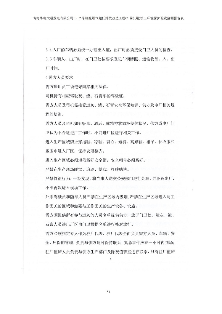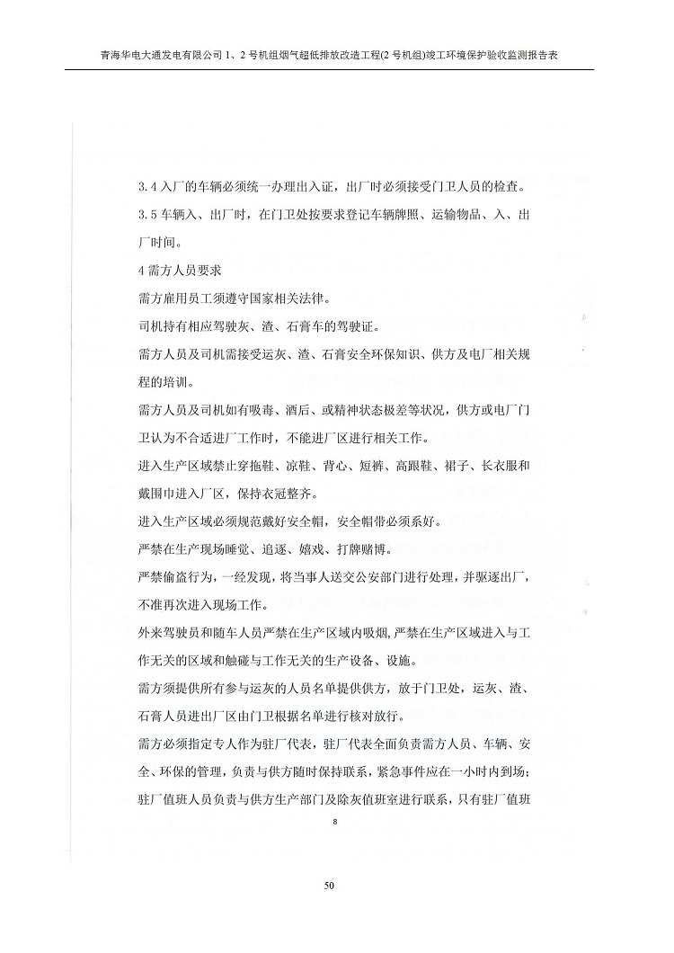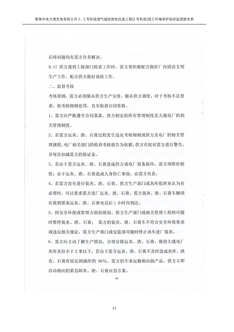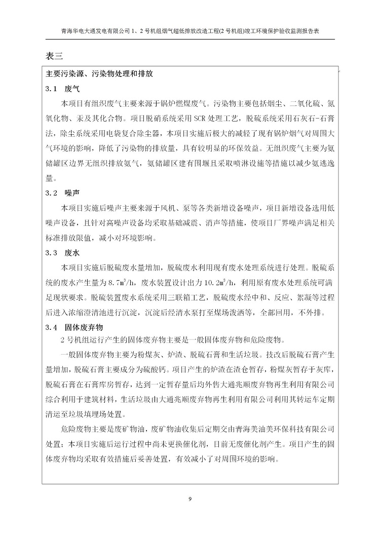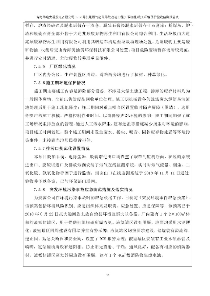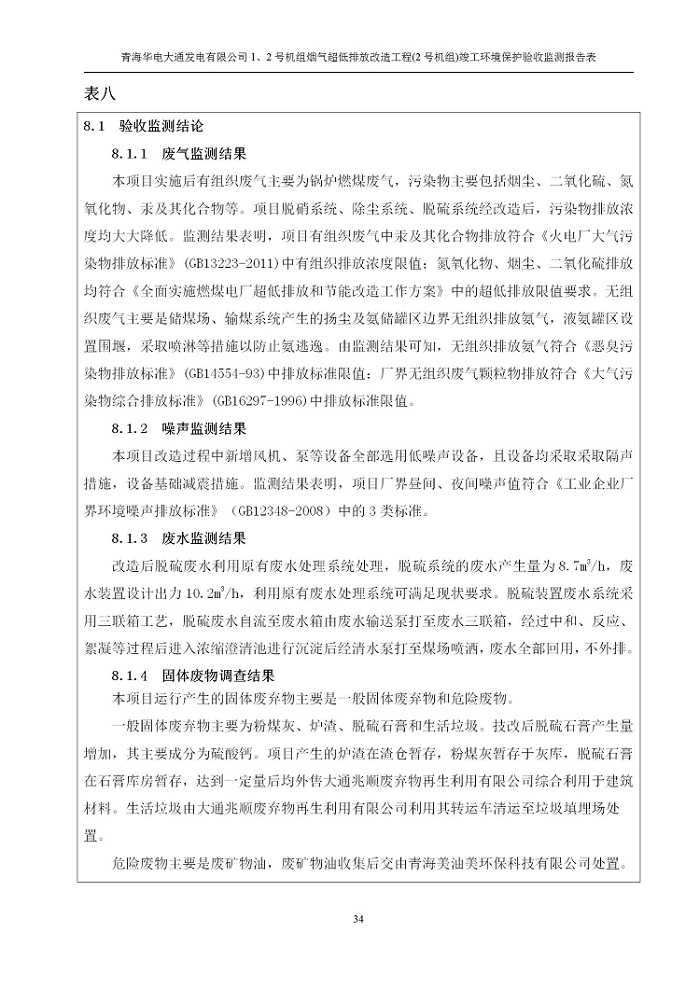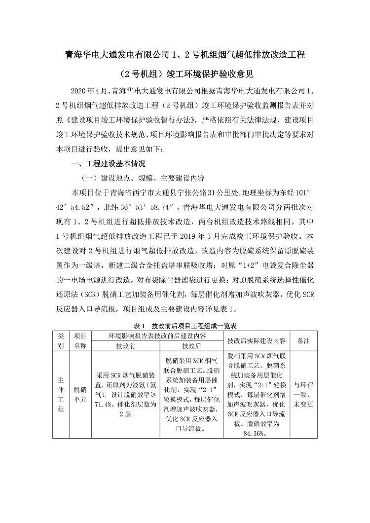 根據(jù)中華人民共和國國務(wù)院令第682號《國務(wù)院關(guān)于修改〈建設(shè)項(xiàng)目環(huán)境保護(hù)管理?xiàng)l例〉的決定》和《建設(shè)項(xiàng)目竣工環(huán)境保護(hù)驗(yàn)收暫行辦法》(國務(wù)院令682號),青海華電大通發(fā)電有限公司1、2號機(jī)組煙氣超低排放改造工程(2號機(jī)組) (包括竣工環(huán)境保護(hù)驗(yàn)收監(jiān)測報(bào)告表和驗(yàn)收意見)公示如下。 一、項(xiàng)目名稱:青海華電大通發(fā)電有限公司1、2號機(jī)組煙氣超低排放改造工程(2號機(jī)組) 竣工環(huán)境保護(hù)驗(yàn)收監(jiān)測報(bào)告表 二、地點(diǎn):青海省西寧市大通縣寧張公路31公里處 三、建設(shè)單位:青海華電大通發(fā)電有限公司 四、建設(shè)內(nèi)容:2號機(jī)組煙氣超低排放改造,2號機(jī)組改造內(nèi)容為脫硫系統(tǒng)保留原脫硫裝置作為一級塔,新建二級合金托盤塔串聯(lián)吸收塔;對原“1+2”電袋復(fù)合除塵器的一電場電源進(jìn)行改造,對布袋除塵器濾袋進(jìn)行更換;對原脫硝系統(tǒng)選擇性催化還原法(SCR)脫硝工藝加裝備用催化劑,每層催化劑增加聲波吹灰器,優(yōu)化SCR反應(yīng)器入口導(dǎo)流板。 五、聯(lián)系人:馬世敏 六、聯(lián)系電 話:0971-6515411 七、公示時(shí)間:二〇二〇年四月二十九日至二〇二〇年五月二十八日 公示期間,對上述公示內(nèi)容如有異議,請以書面形式反饋,個(gè)人須署真實(shí)姓名,單位須加蓋公章。