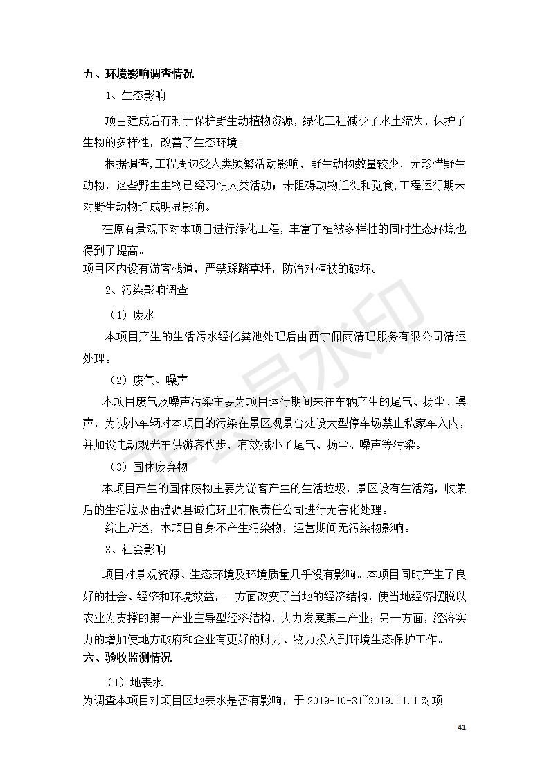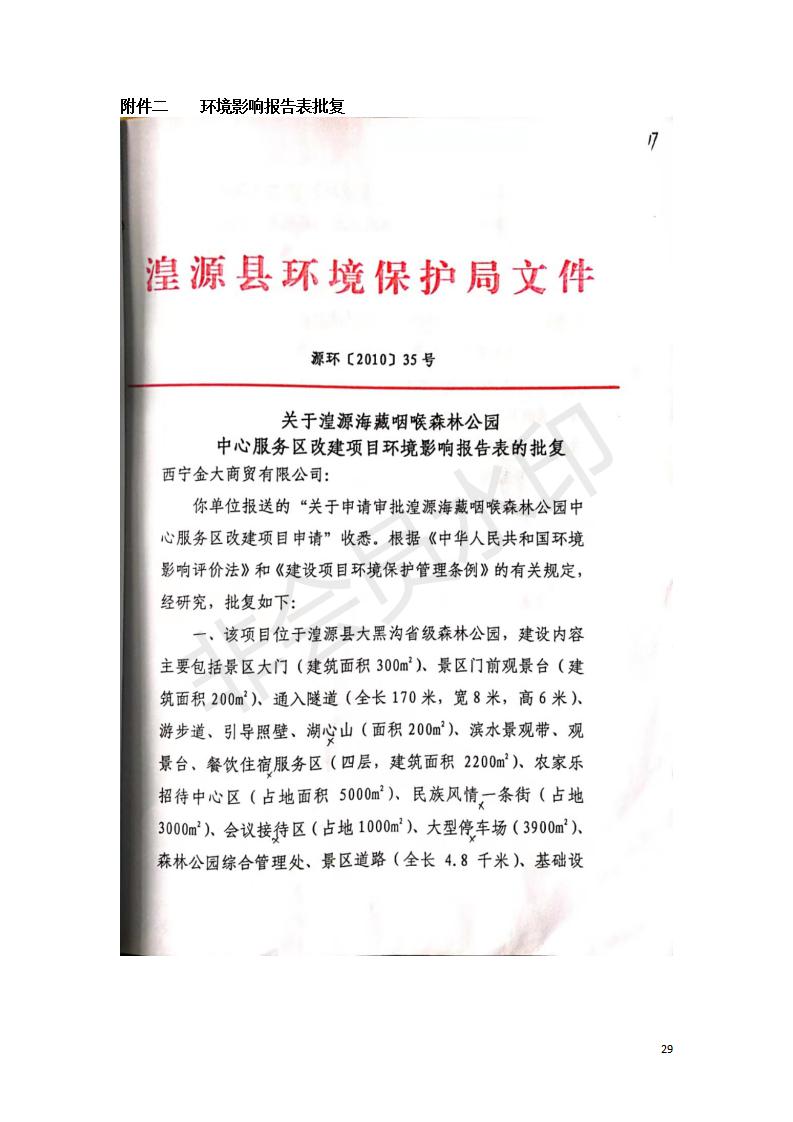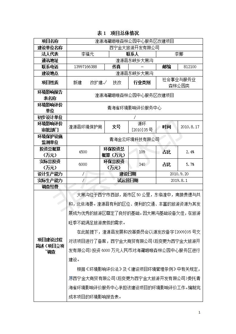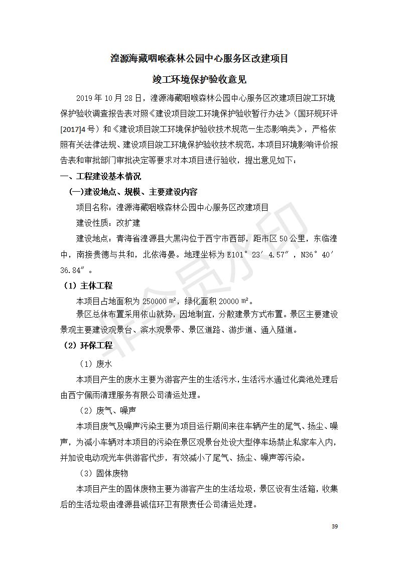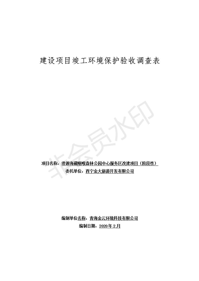 根據(jù)中華人民共和國國務院令第682號《國務院關于修改〈建設項目環(huán)境保護管理條例〉的決定》和《建設項目竣工環(huán)境保護驗收暫行辦法》(國務院令682號),湟源海藏咽喉森林公園中心服務區(qū)改建項目(階段性),(包括竣工環(huán)境保護驗收調查表和驗收意見)公示如下。 一、項目名稱:湟源海藏咽喉森林公園中心服務區(qū)改建項目(階段性) 竣工環(huán)境保護驗收調查表 二、地點:青海省湟源縣東峽鄉(xiāng)大黑溝 三、建設單位:西寧金大旅游開發(fā)有限公司 四、建設內容:本次階段性驗收以自然景觀為主,建設內容為濱水景觀帶、觀景臺、景區(qū)道路及基礎設施。項目范圍從景區(qū)大門至中心位置,全長4800m。 五、聯(lián)系人:張工 六、聯(lián)系電 話:0971-6515411 七、公示時間:二〇二〇年四月二十九日至二〇二〇年五月二十八日 公示期間,對上述公示內容如有異議,請以書面形式反饋,個人須署真實姓名,單位須加蓋公章。