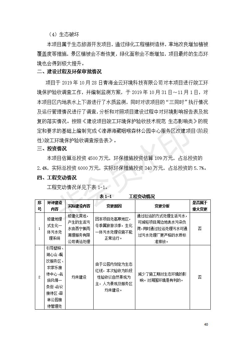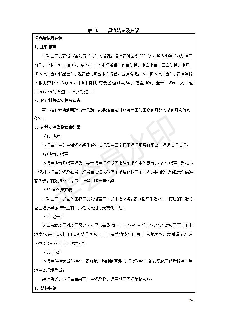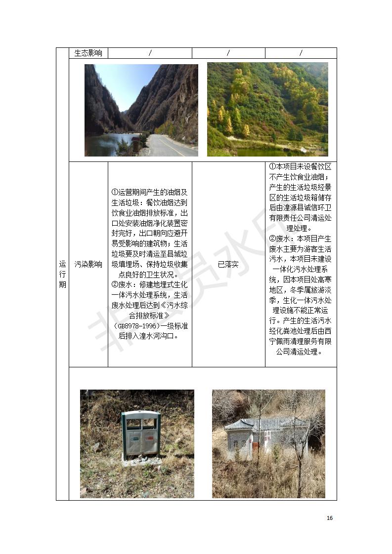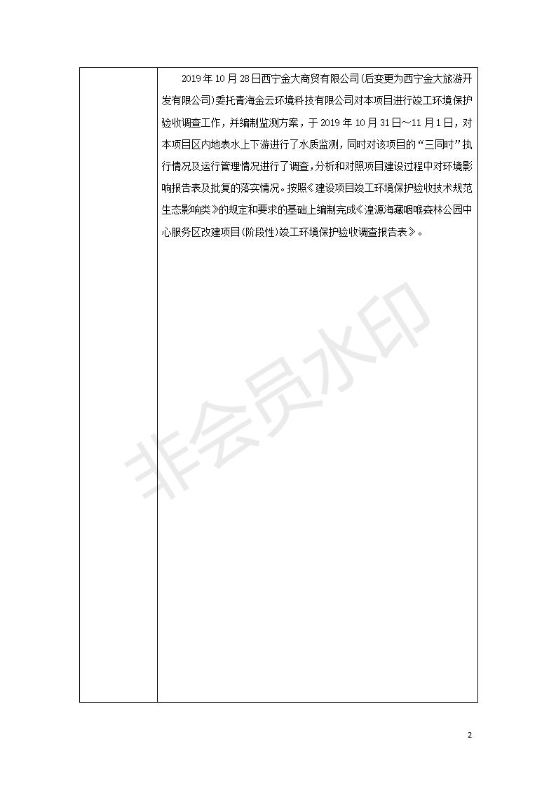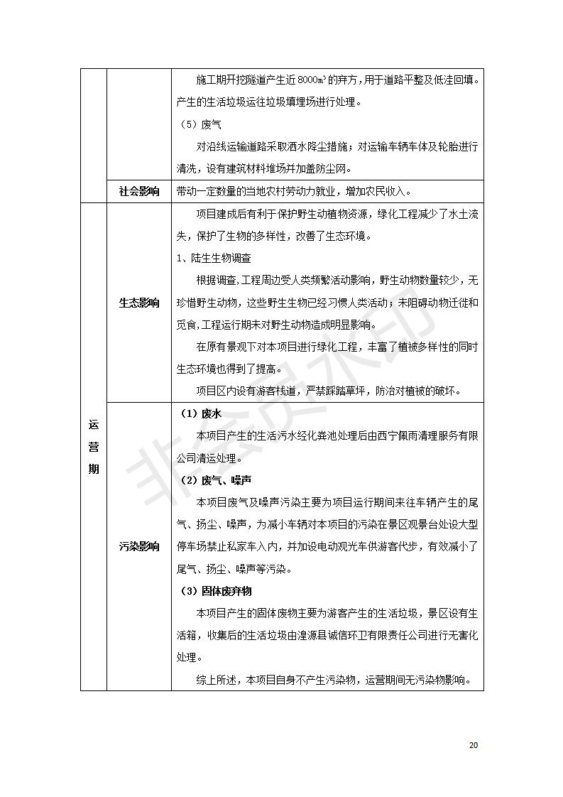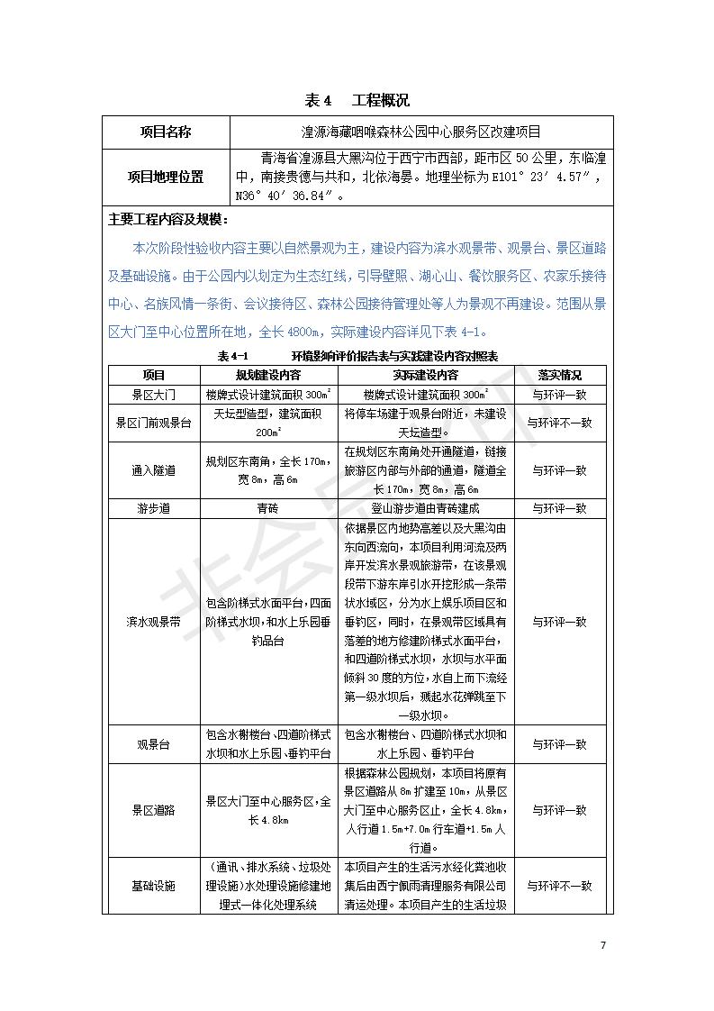 根據(jù)中華人民共和國國務院令第682號《國務院關于修改〈建設項目環(huán)境保護管理條例〉的決定》和《建設項目竣工環(huán)境保護驗收暫行辦法》(國務院令682號),湟源海藏咽喉森林公園中心服務區(qū)改建項目(階段性),(包括竣工環(huán)境保護驗收調查表和驗收意見)公示如下。 一、項目名稱:湟源海藏咽喉森林公園中心服務區(qū)改建項目(階段性) 竣工環(huán)境保護驗收調查表 二、地點:青海省湟源縣東峽鄉(xiāng)大黑溝 三、建設單位:西寧金大旅游開發(fā)有限公司 四、建設內容:本次階段性驗收以自然景觀為主,建設內容為濱水景觀帶、觀景臺、景區(qū)道路及基礎設施。項目范圍從景區(qū)大門至中心位置,全長4800m。 五、聯(lián)系人:張工 六、聯(lián)系電 話:0971-6515411 七、公示時間:二〇二〇年四月二十九日至二〇二〇年五月二十八日 公示期間,對上述公示內容如有異議,請以書面形式反饋,個人須署真實姓名,單位須加蓋公章。